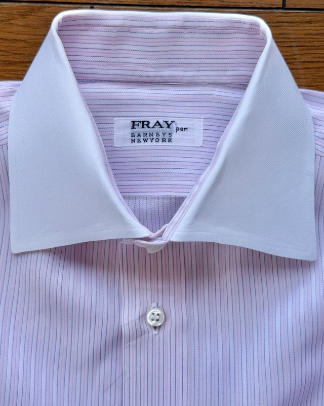 1990年に初上陸した初代ハケットは日本のダイドーリミテッドによるライセンスものと直輸入物がありましたがこちらは直輸入のドレスシャツです。英国製といえばゆったりとした身頃が特徴、ふんだんに生地を使う贅沢な作りが高級なシャツの証とか…デザインはブリティッシュトラッドの王道、クラシックなダブルカフのカッタウェイカラーになっています。