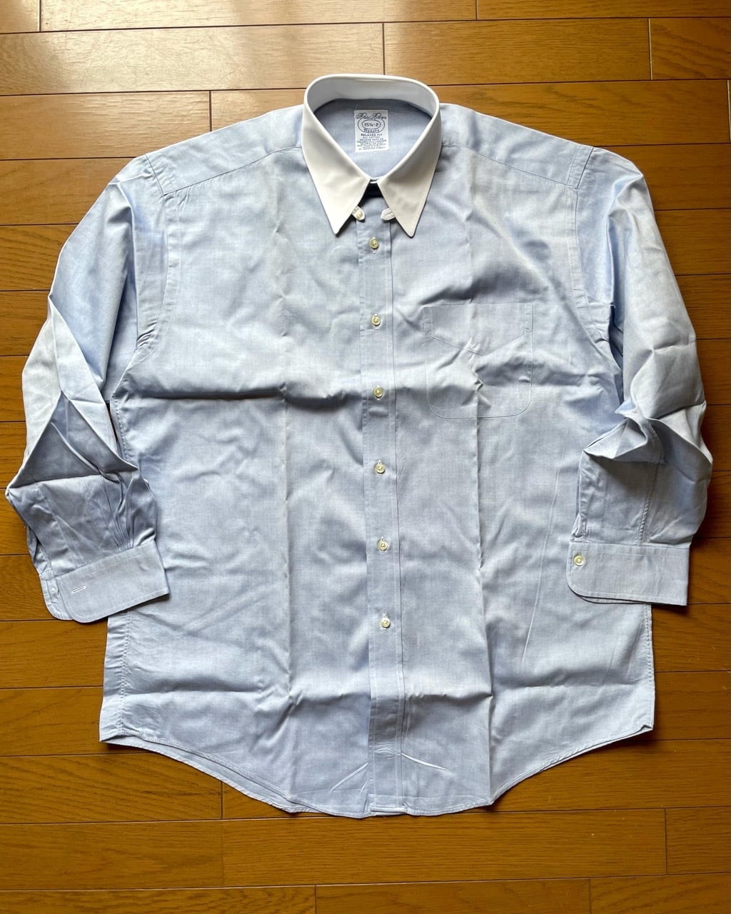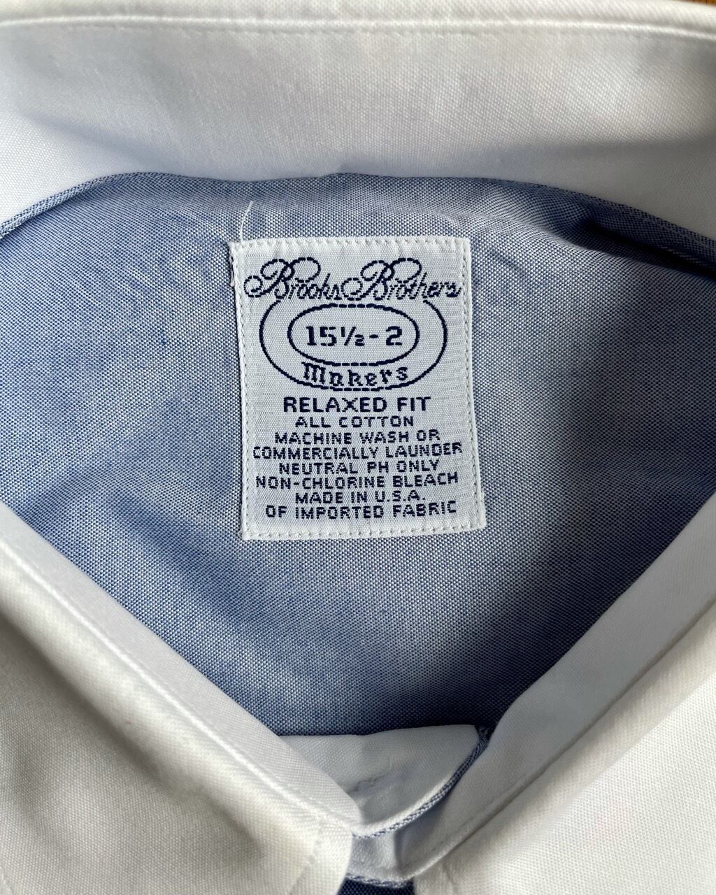 ブルックスブラザーズの自社製シャツに付くMakersの文字が読み取れるタグ。1990年代にアメリカで購入したタブカラーシャツは通常のオックスフォードより番手の高いピンポイントオックス生地を採用、シルエットはタグのリラックスフィットから分かるようにブラウジングルックのゆったりとした作りが特徴です。サックスタイルのスーツやブレザーと合わせてトラッドスタイルを楽しんでみては如何でしょうか。
