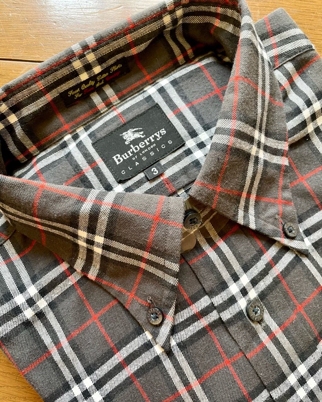 日本国内ブティック購入バーバリークラシックのグレーノバチェックボタンダウンシャツの紹介です。胸ポケットのプローサムマークやバーバリーの刻印入りの前ボタンなどブランドイメージを各所に盛り込んだBDシャツはガウントレットボタンや角落型のカフなど気の利いたデザインで洒落心をくすぐります。素材は柔らかなコットンで単品で着てよし、カシミアジャケットやセーターの下に着てよしと用途の広い商品となっています。