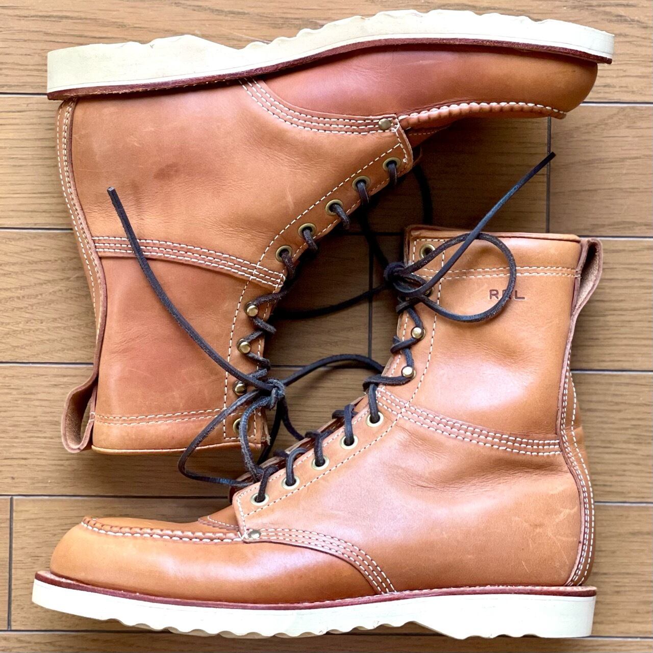 ダブルアールエルのワークブーツBurnel(ブルネル)の紹介です。ラセット色のベジタンレザーにネオプレーンソールを装着したタフな仕様に加え、羽根の付け根やプルタブ部分に補強用のリベットを打つなどラギットな仕様が特徴です。レッドウィングやチペワなどと共通するホワイトソールを装着したブーツの初代モデルとしてアメリカ本国では490ドルの定価販売、現地とほぼ同じ価格で店頭に並べました。在庫は9-Dが一点のみ、箱やシューバッグに替紐付です。