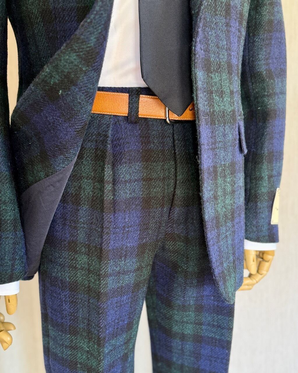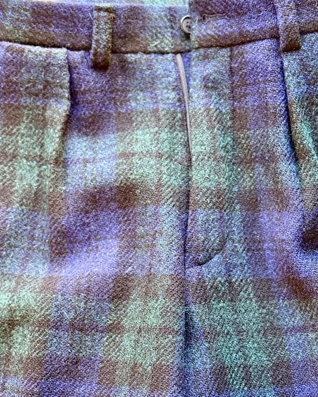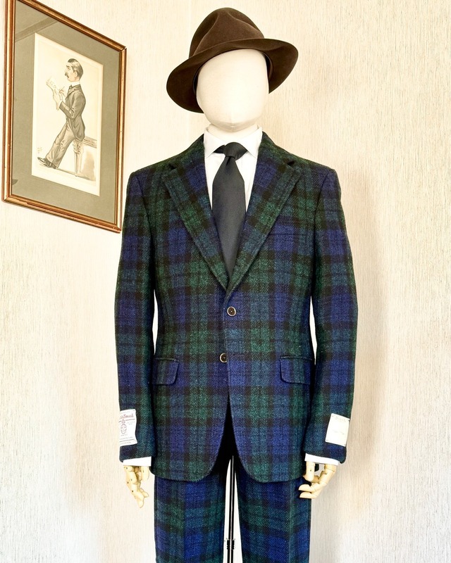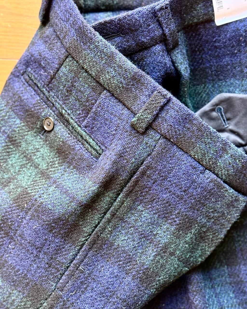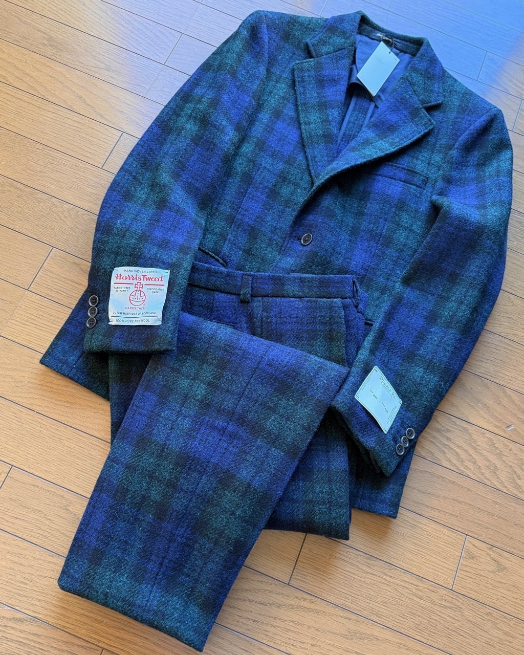 ブラックウォッチ柄のハリスツイードで仕立てたジャケットと共布トラウザースの紹介です。ジャケットはRRL、サイズは42Rですが作りが小さいため40Rとほぼ同じサイズ感、ウェルトシームや3つボタン段返りのラペルなどアメリカントラッドを感じさせる作りになっています。縫製はテイラードものに定評のあるイタリア製となります。一方トラウザースはサウスウィックネーム、アメリカのロチェスターテーラードクロージングで縫製されています。ウエストは32インチ、ハイウェスト気味でプリーツ有りのストレートなシルエットが特徴です。スコットランド産のツイードを素材にイタリアとアメリカそれぞれのファクトリーで作られた逸品の組み合わせは希少です。