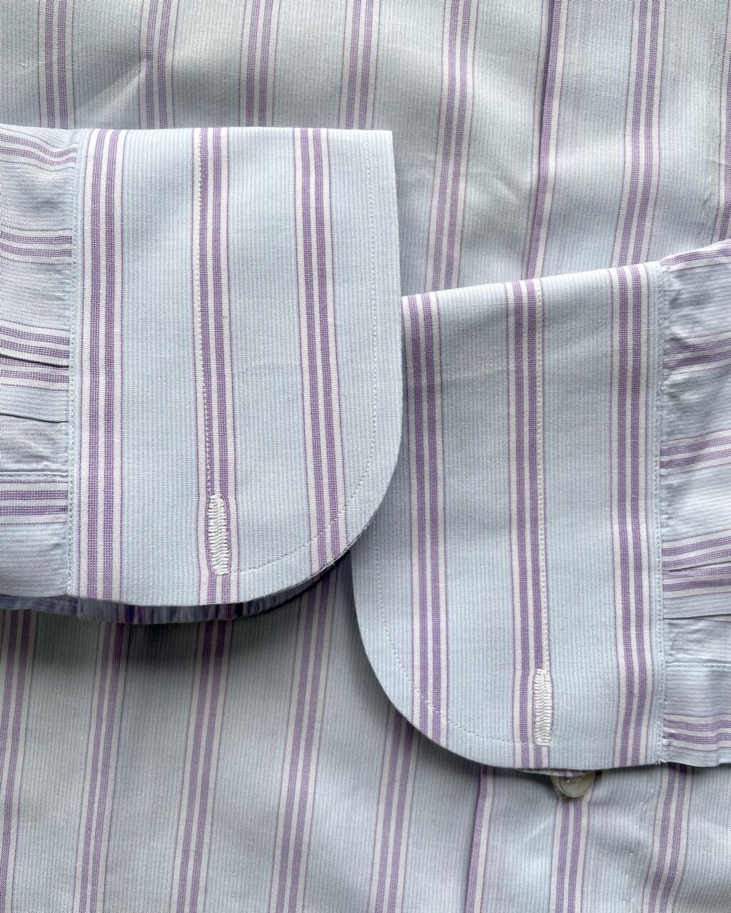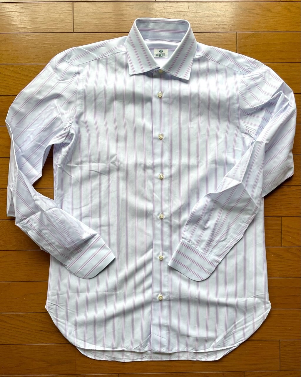 ナポリのルイジボレッリからブルー/パープルストライプのカッタウェイカラーシャツの紹介です。手仕事による襟付けや袖付け、前立てや手縫いのボタンホールなどお馴染みのディテールにサックスブルーとパープルのオルタネートストライプが爽やかな印象を与えます。ブルーのジャケットに合わせたりナポリ仕立てのスーツと合わせたりと使い道の多いシャツです。