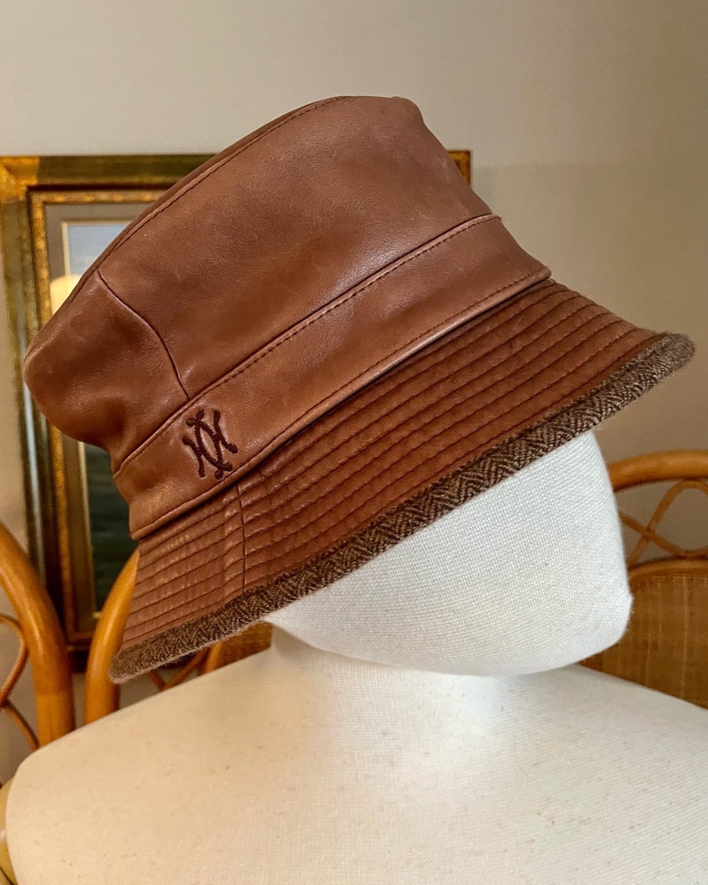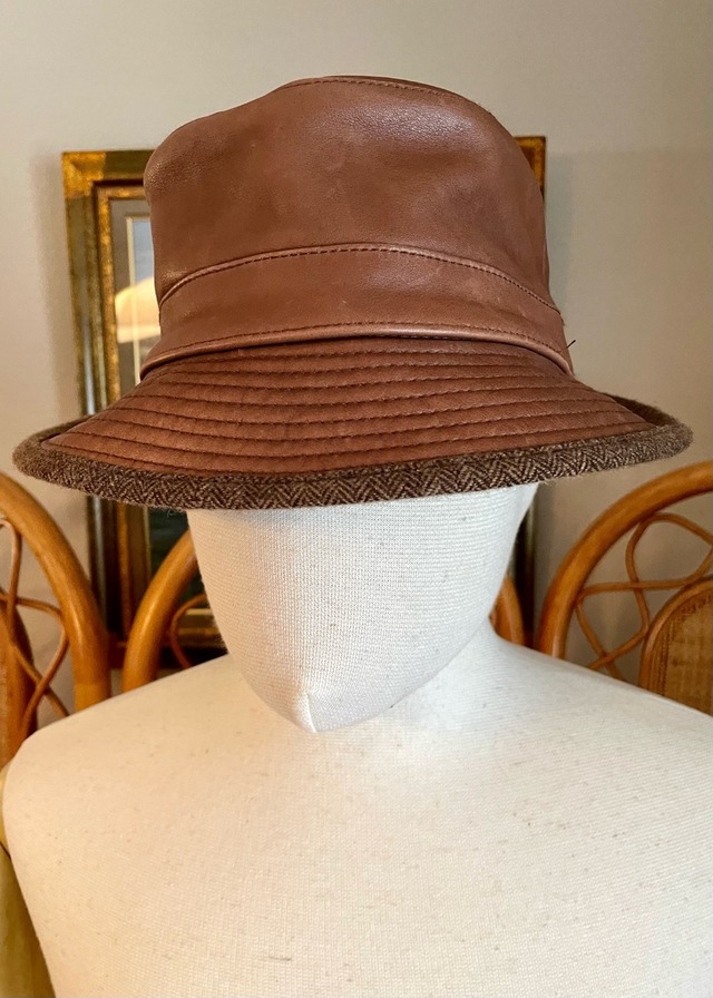 エルメスとモッチのダブルネームバケットハット(バケツ型帽子)の紹介です。柔らかなレザーと肌触りの良いヘリンボーン柄のカシミア100%のダブルフェイスが高級感を高めています。凱旋門にほど近い地に店を構えていた帽子屋のモッチは1887年創業の名店、1991年にエルメスの傘下に入り今は店舗にモッチの名はなくエルメスブティックとして帽子を中心としたラインナップで営業を続けています。このモッチプールエルメスはユーズドの中でも特に人気の高いアイテムとなっています。レザー側にはエルメスのイニシャルであるダブルHが刺繍され、カシミア側にひっくり返すとモッチプールエルメスのタグが見えるようになっています。エルメスの隠れた名品旧モッチとのダブルネームハットは在庫一点のみです。