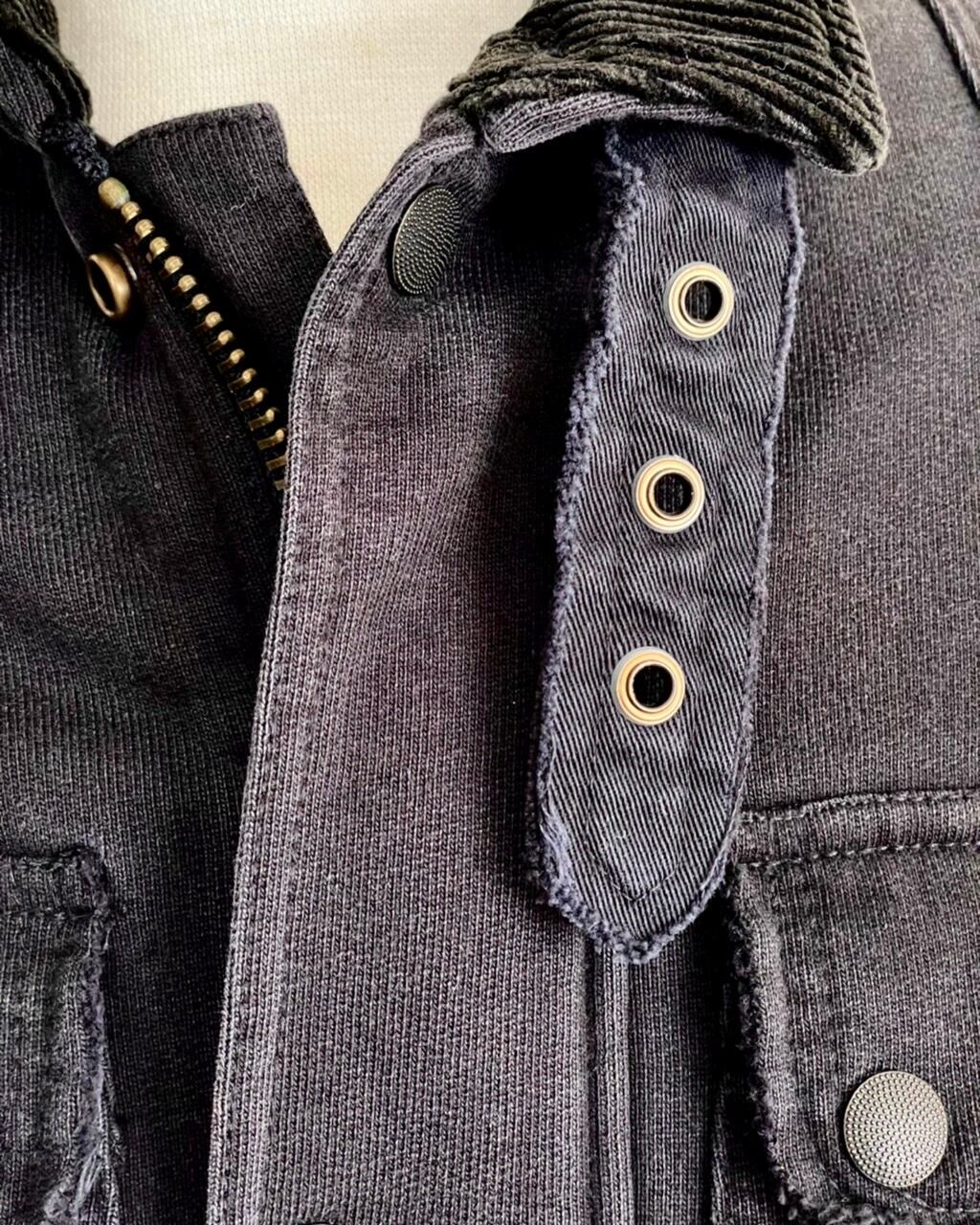 惜しまれつつ終了したラグビーbyラルフローレンからコットンジャージ素材のライダースジャケットの紹介です。エイジング加工や袖先、ポケットのフラップ等に施されたダメージ加工は着初めからビンテージウェアのような風合いを楽しめます。肩当てや肘当てがついた本格的な作りにウエストで締める共布のベルトや左胸に付くエンブレムなど、仕上がりに抜かりはありません。