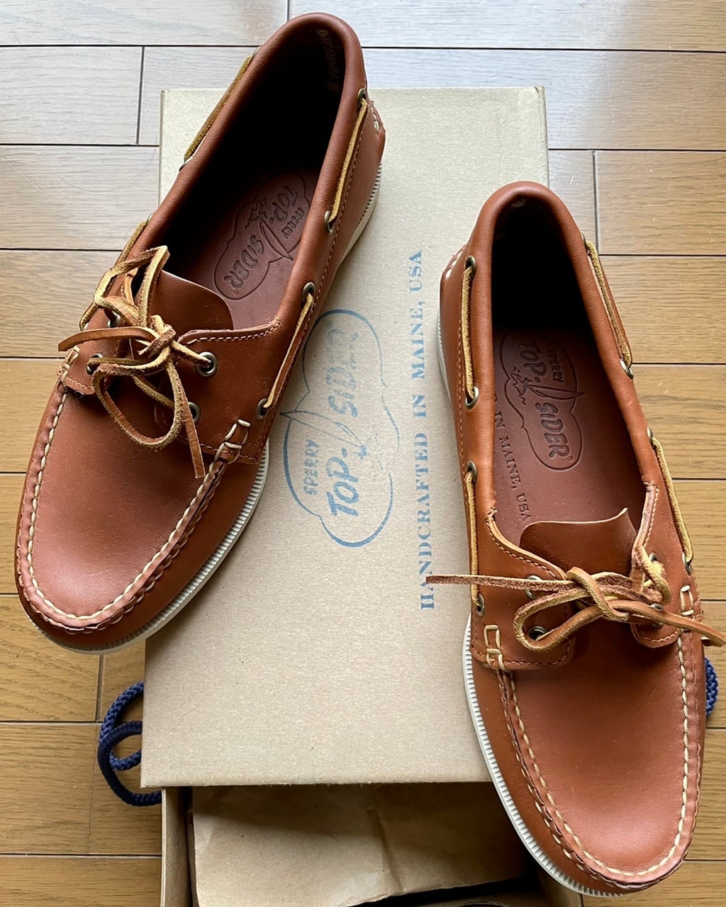 カジュアルシューズの老舗トップサイダーからアメリカ製のデッキシューズの紹介です。グローブのような肉厚のタンレザーを用いたデッキシューズはアメリカンハンドソーンモカシンの聖地、メイン州のランコート社が製造を請け負っているようです。トップサイダーをはじめLLビーンやセバゴなど次々とアメリカ製造を中止する中、限定で作られたアメリカ製のトップサイダーは大変珍しいものになっています。