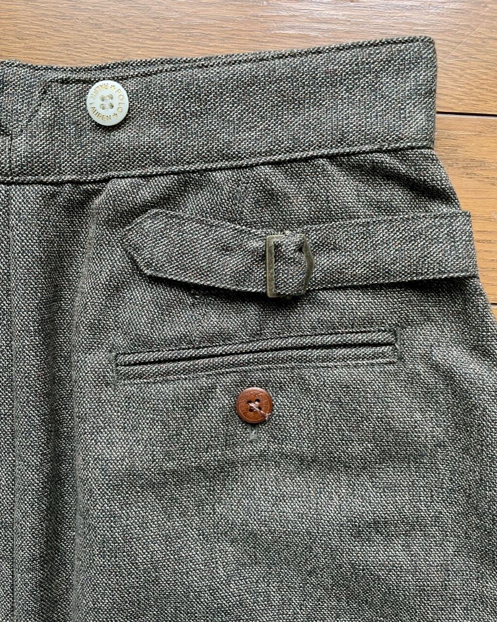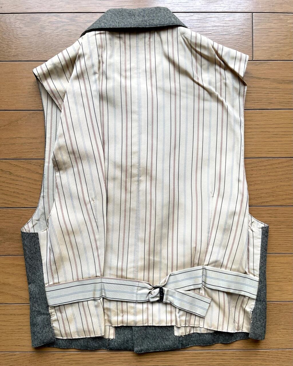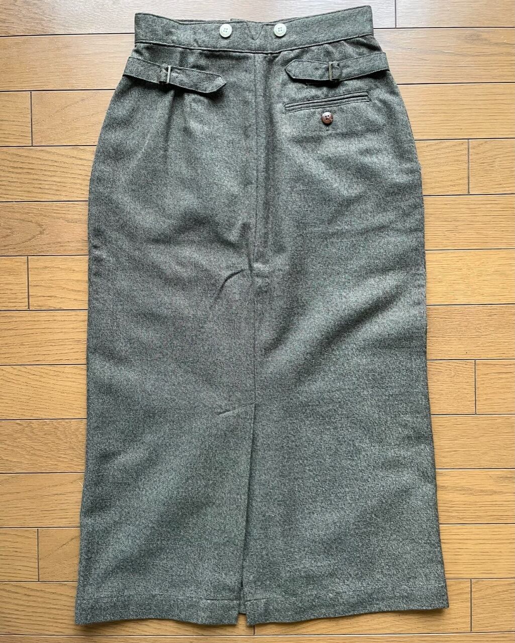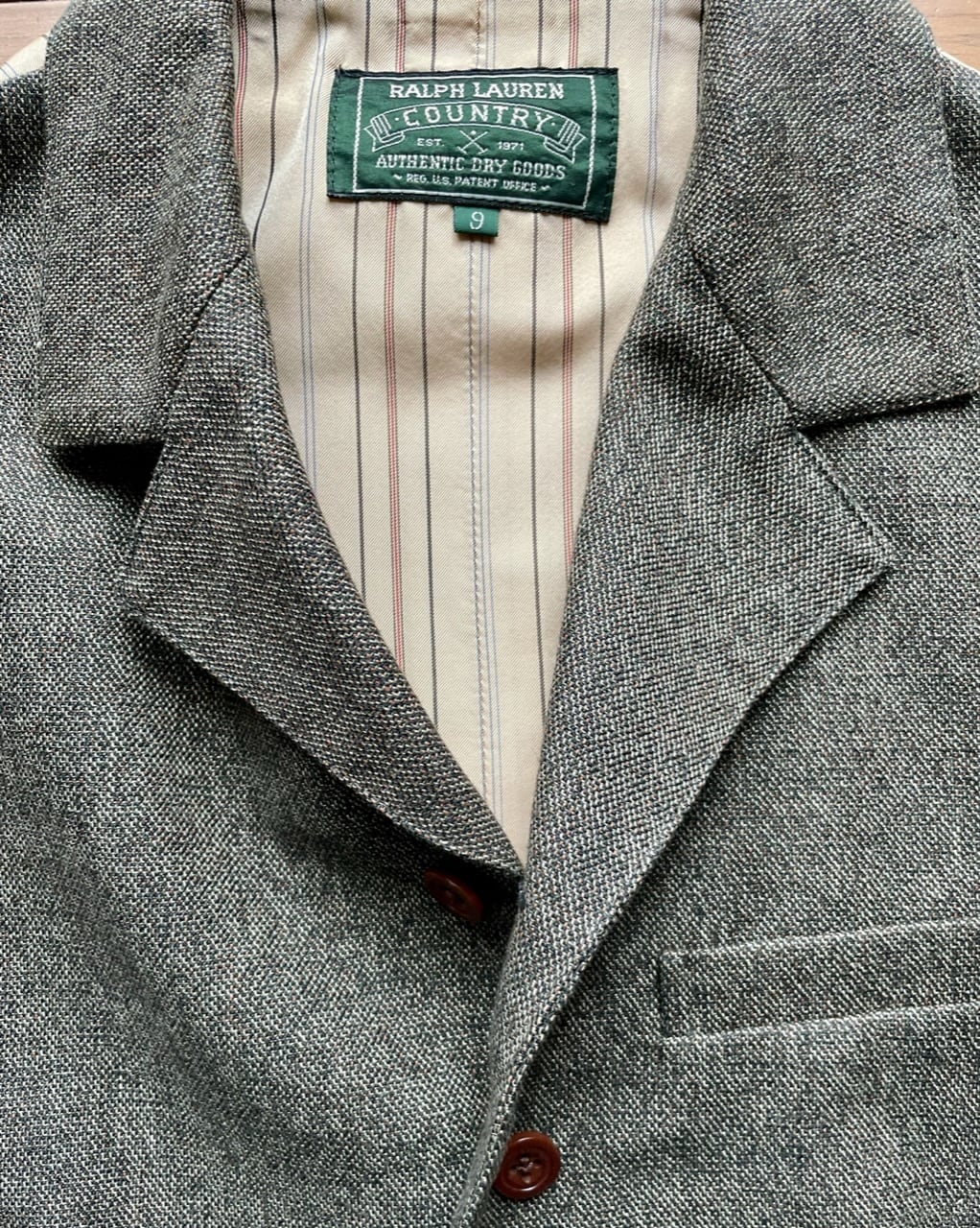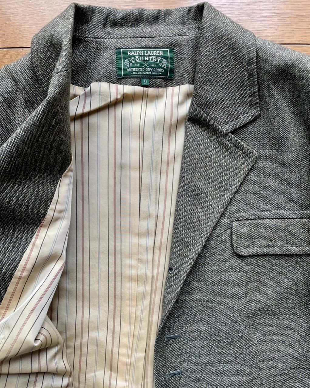 RRLの前身として根強いファンのいるポロカントリーからレディス版ラルフローレンカントリーの紹介です。打ち込みの厚いコットンとウールの混紡ツイード生地を用いてスリーピーススーツに共布のスカートが付いた珍しいフォーピース。ラペルドベストやウォッチポケットにサイドアジャスター付きのスカート、サスペンダーボタンの付いたワイドなパンツなどメンズ以上にこだわりのある作り込みがなされています。インパクト21のタグがある旧PRLジャパンの製品になります。ラルフローレンファンの女性に是非着てもらいたい1着です。