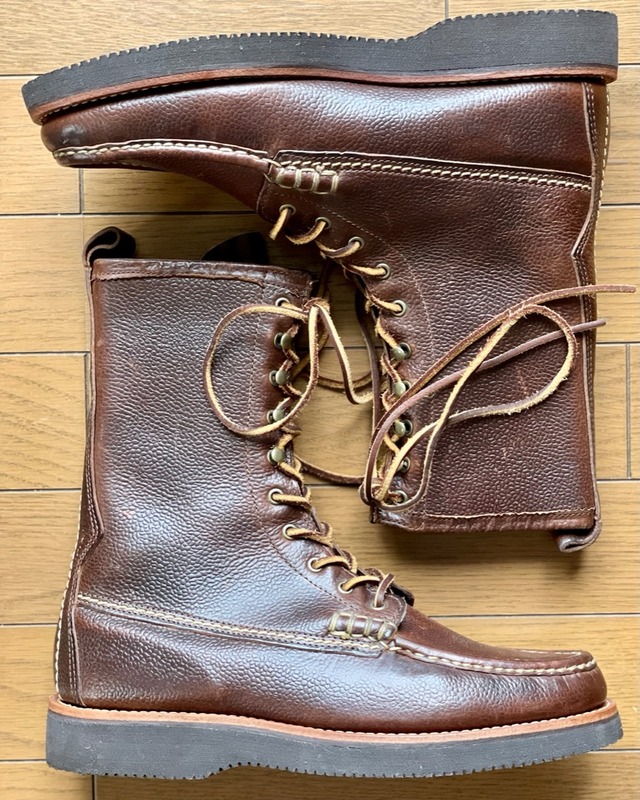 Yuketenは日本人デザイナーYuki Matsuda氏がメイン州のシューメーカー”クオッデイ”のケビンとクリステンと共に立ち上げたブランド。Yu(ki)+Ke(vin)+(Kris)Tenと3名の名前を組み合わせてブランド名としています。クオッデイのファクトリーから生み出される商品は伝統的なアメリカンモカシンにひねりを加えたものが有名ですがこちらはラッセルモカシンを彷彿とさせる出来栄え。太めのステッチが力強さを感じさせるかぶせモカや整然と並ぶ5列の外鳩目に4列のフック、ロングシャフトのブーツらしいアウトドアテイスト満点の仕上がりとなっています。