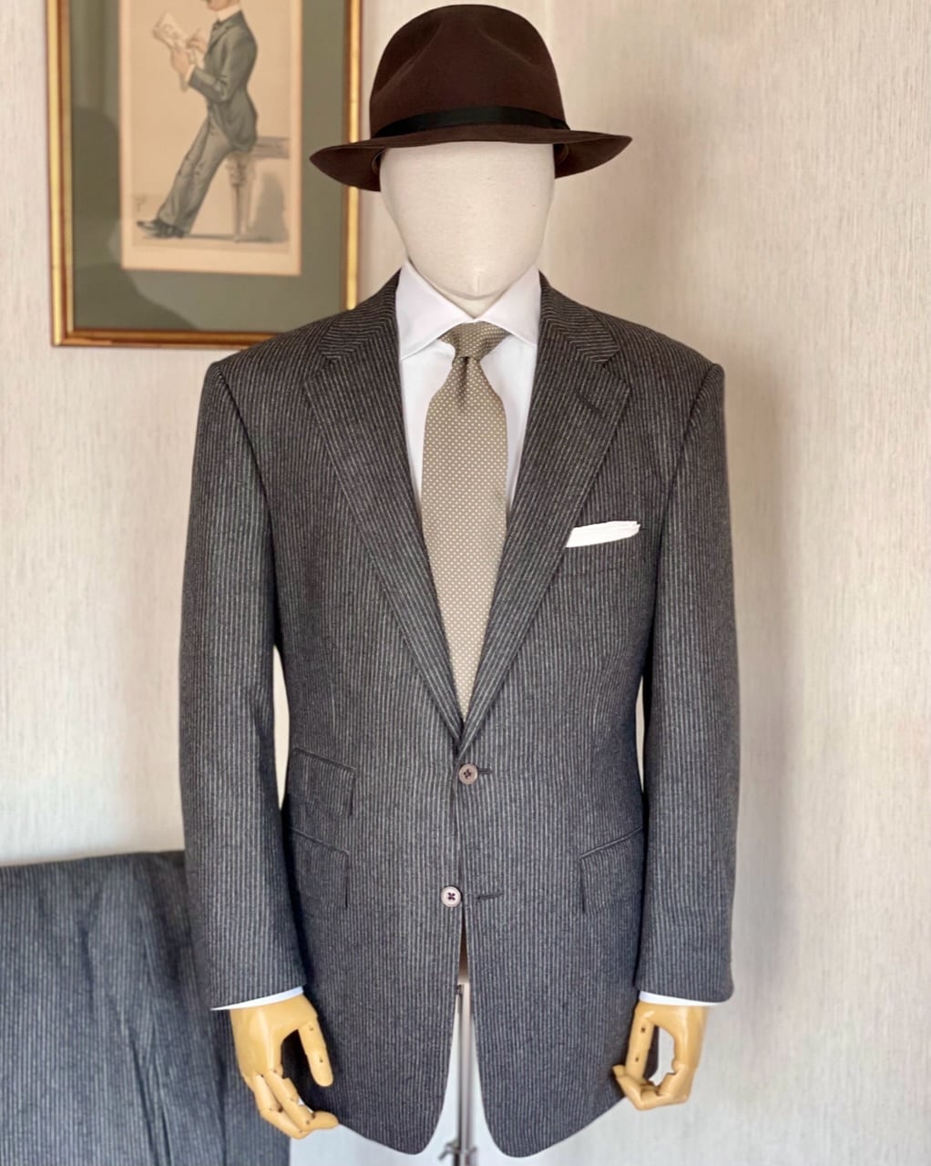 今や希少なラルフローレンパープルレーベルの英国製スーツになります。縫製はチェスターバリーながら日本のブティックで購入したものでサイズ表記がA7(≒39R)となっています。生地は遠目には無地に見えるグレーフランネルのペンシルストライプです。デザインはオーソドックスな2つボタン。チェンジポケットやスクエアなフロントカット、パッドの入ったショルダーはややワイド気味。ナチュラルショルダーのポロレーベルと比べてラルフローレン氏のこだわりが反映されたスタイルです。