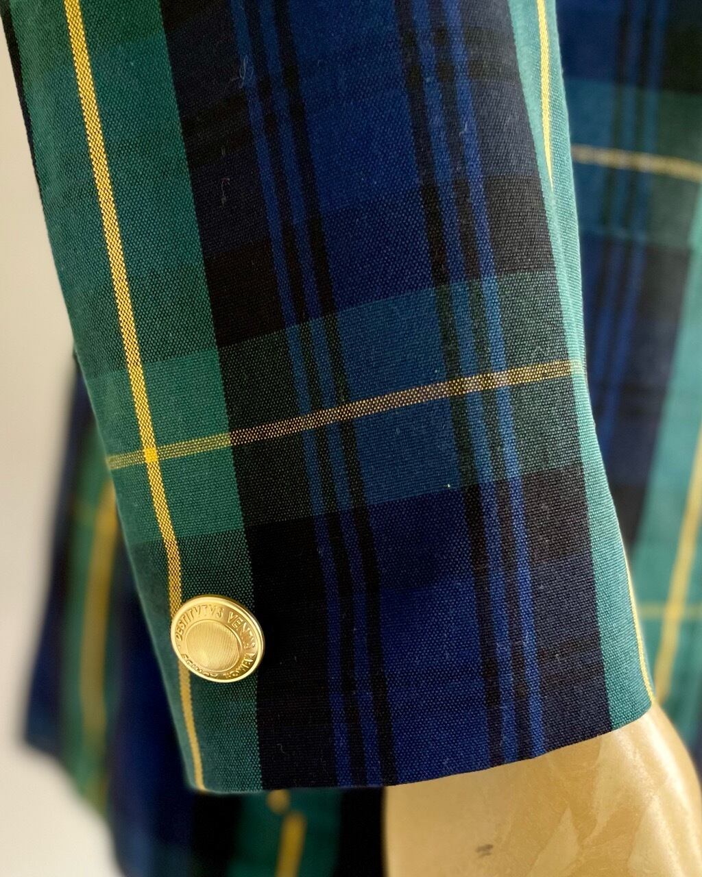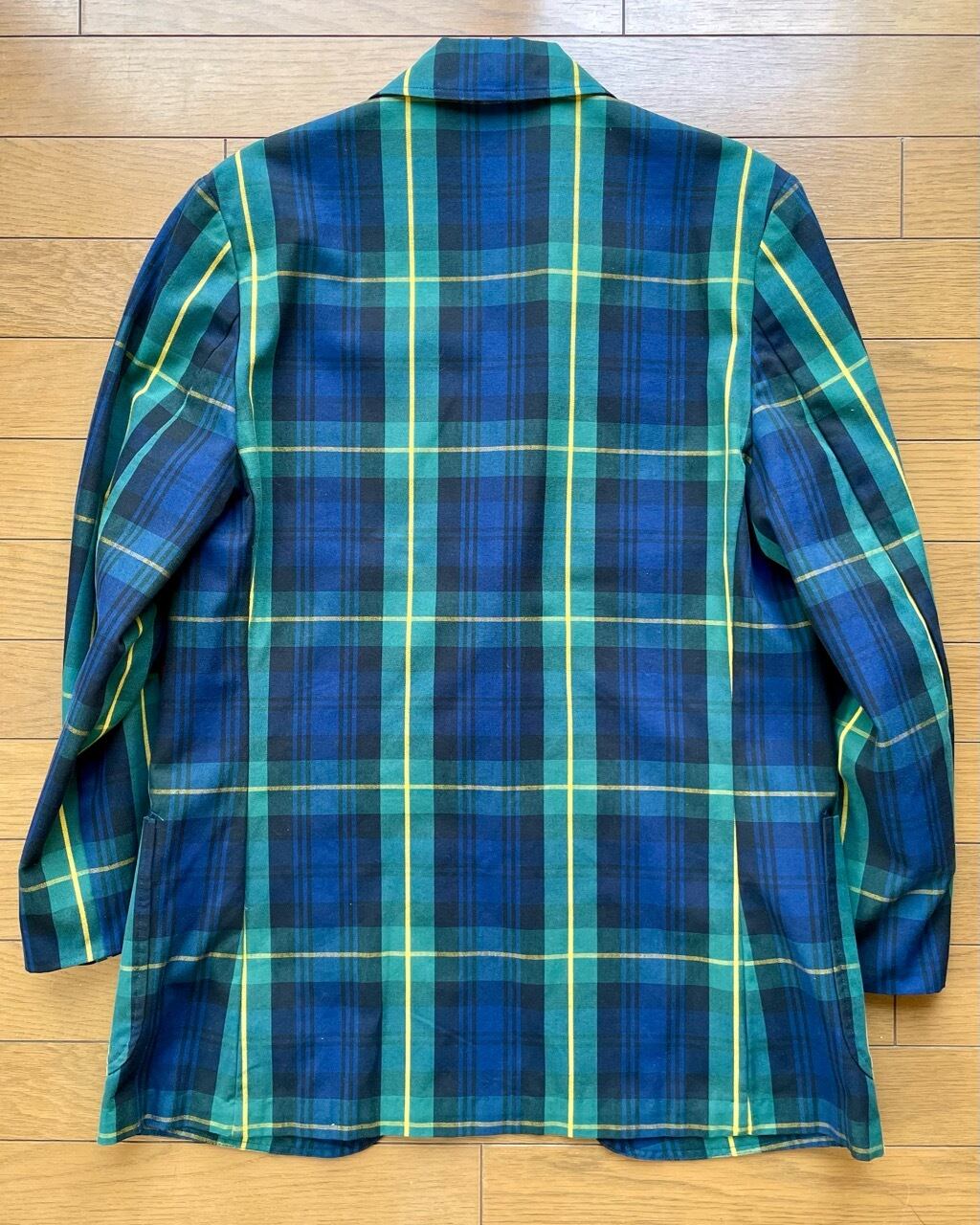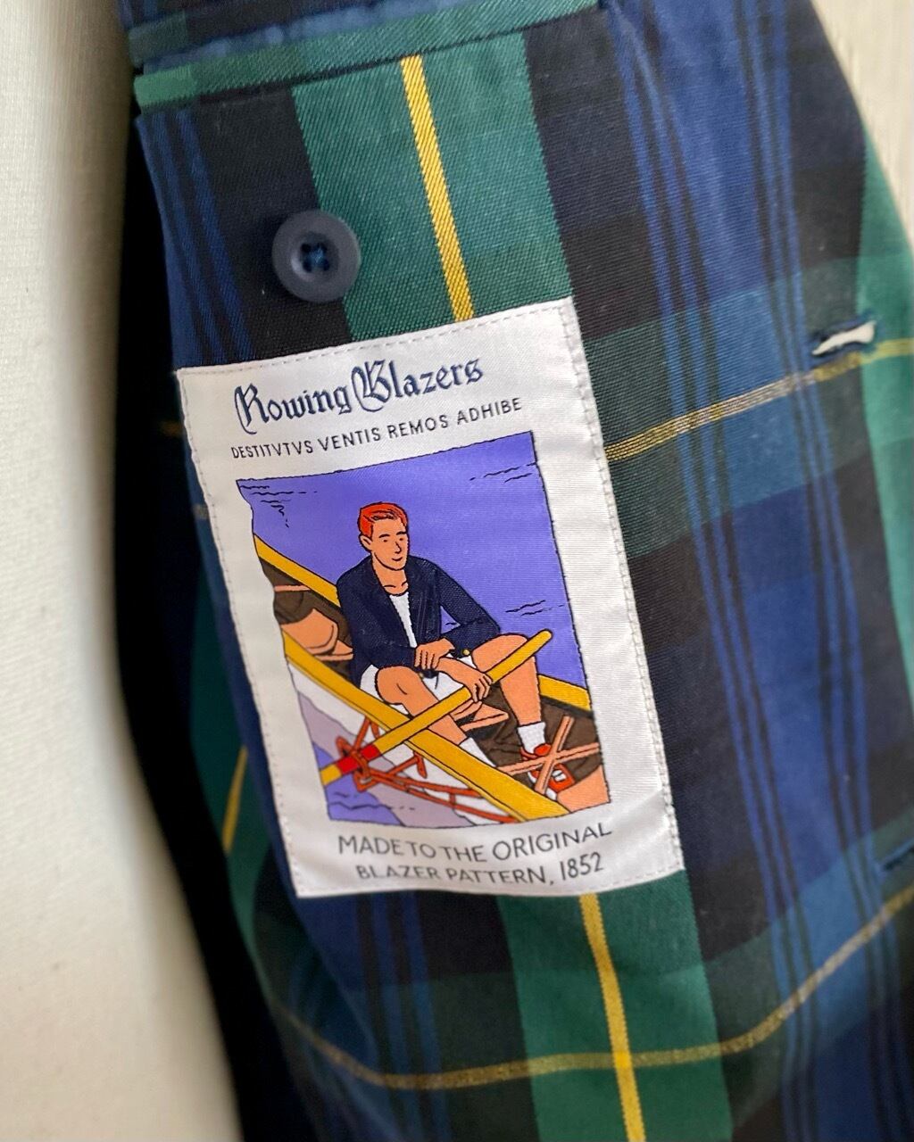 オックスフォード大学でレガッタ選手だったアメリカ人のジャックカールソン氏により2017年に創業されたローイングブレザーズは名前のとおりブレザーがアイコンのブランドです。写真は伝統的なキャンベルタータン(生地は日本製)で仕上げたコットンツイルを用いたジャケットとパンツのセットアップ。ブレザーズの名のとおり金ボタン付きでノーベントのアンコン仕立てはローイングブレザーズの定番です。ジャケットは38RでパンツがW28の組み合わせですがパンツはウエストがゆったり目なので表記はW28でも実寸はW30が適当です。