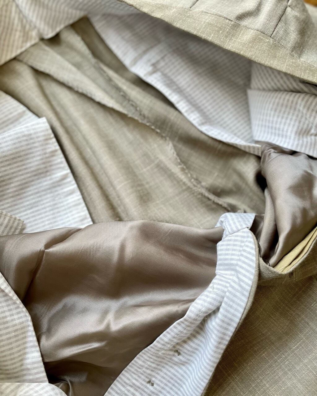 パルマのパンツ専業ブランドローターからベルトレスパンツの紹介です。長い持ち出しをサイドで留めてベルトレスで履くデザインはロータならでは。イタリアのパンツでは定番のリバースプリーツがフォワードプリーツの英国調とは一線を画してます。素材はクリスピーな三者混、ウールにモヘアと麻が加わることで独特の仕上がりになりました。