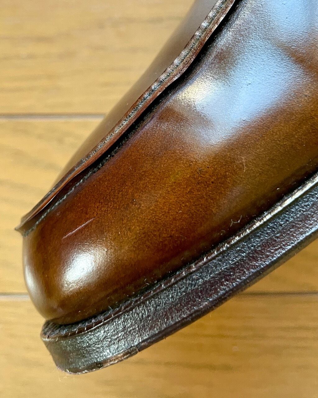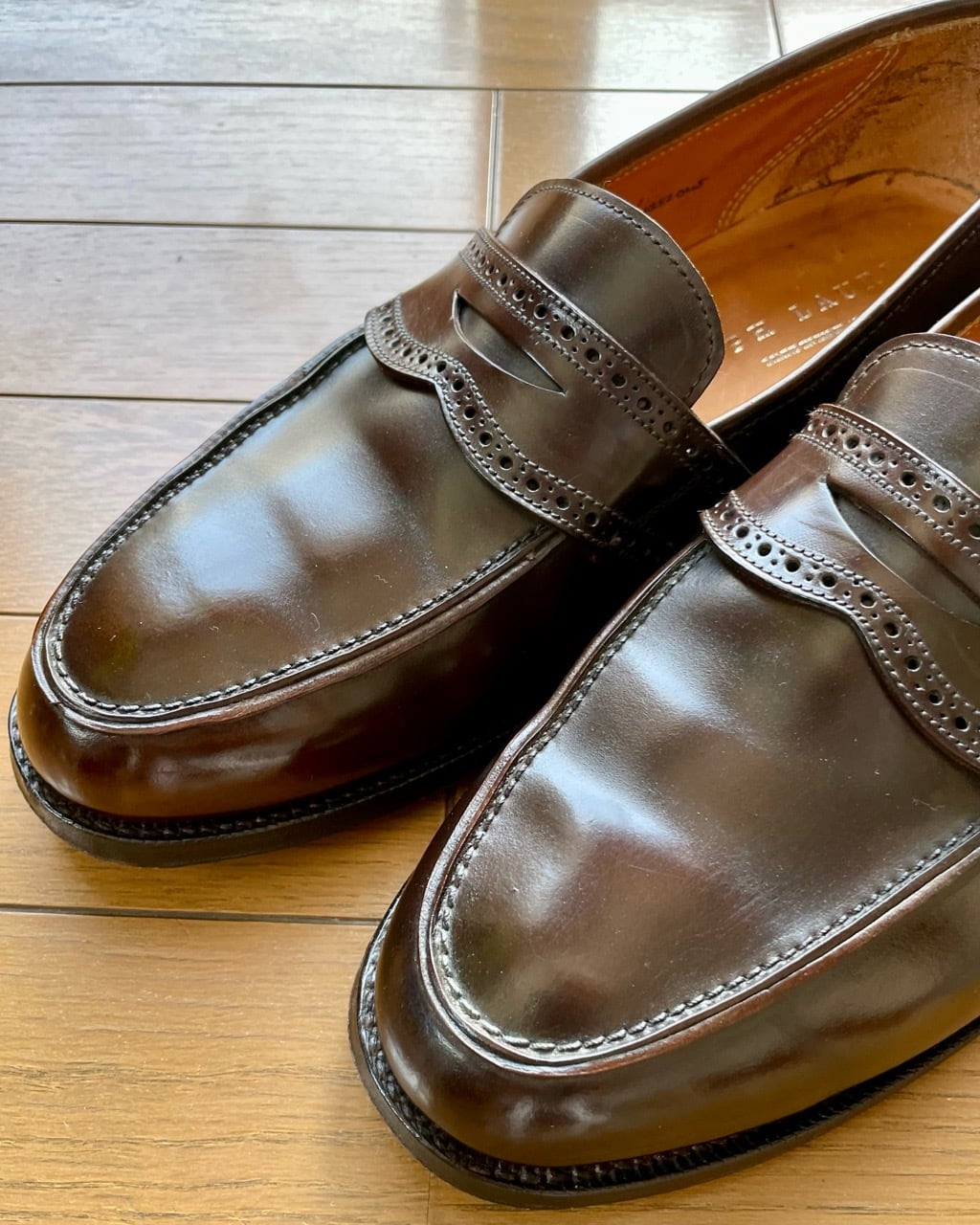 靴好きを魅了したラルフローレンのコードバンシリーズからローファーの紹介です。一番人気だったリボンローファーに加え、ハーフサドルとタッセル付きにパーフォレーションがサドルに入る写真のタイプとローファーだけで4型も展開するなど当時ラルフローレンフットウェアは圧巻の品揃えでした。本品は個人使用の中古品ですので履き皺、細かな擦り傷、つま先(プレート)や踵のラバーおよびヒールトップの減りなどが御座います。また写真で掲載した場所意外にも小傷等が考えられますが中古品ですのでご容赦願います。
