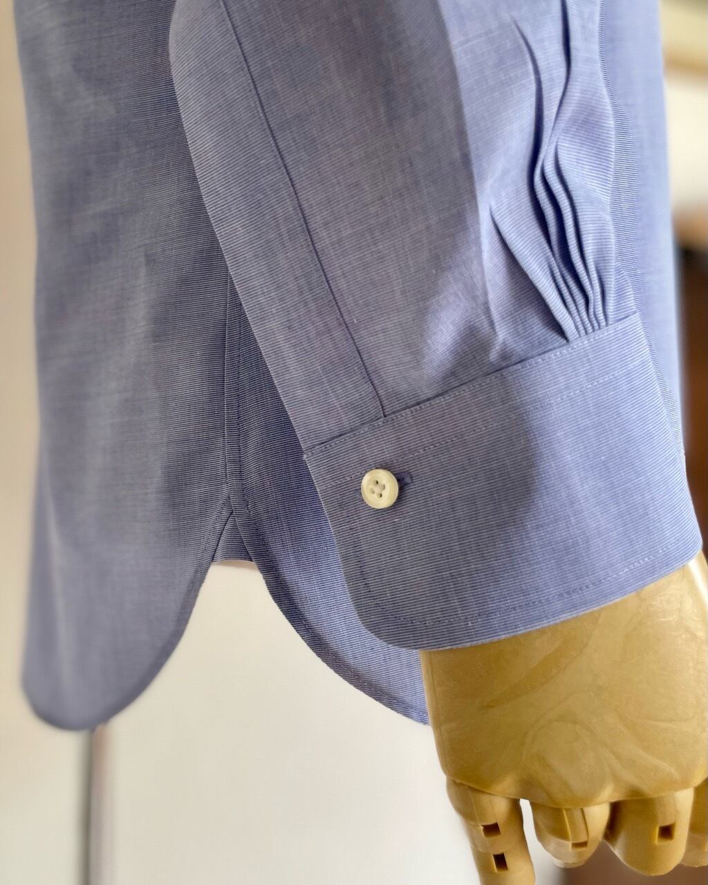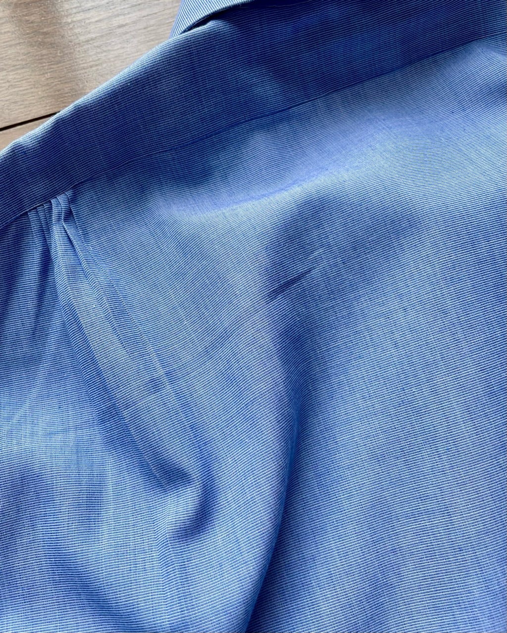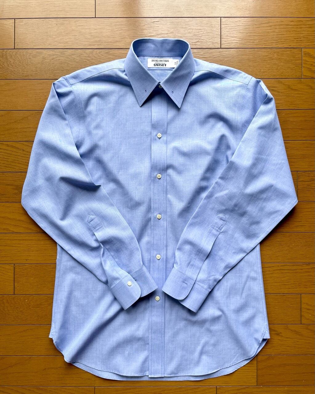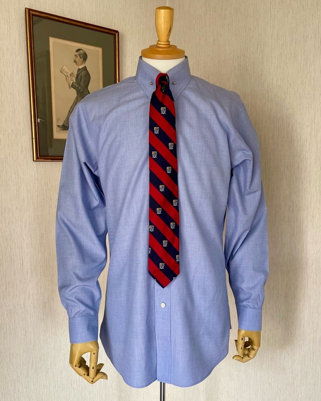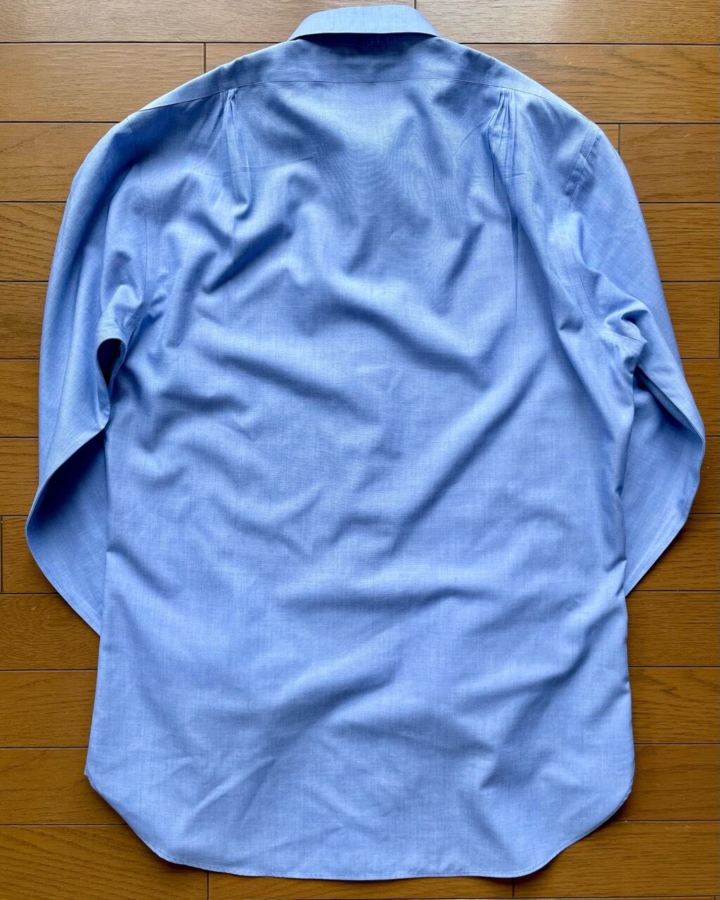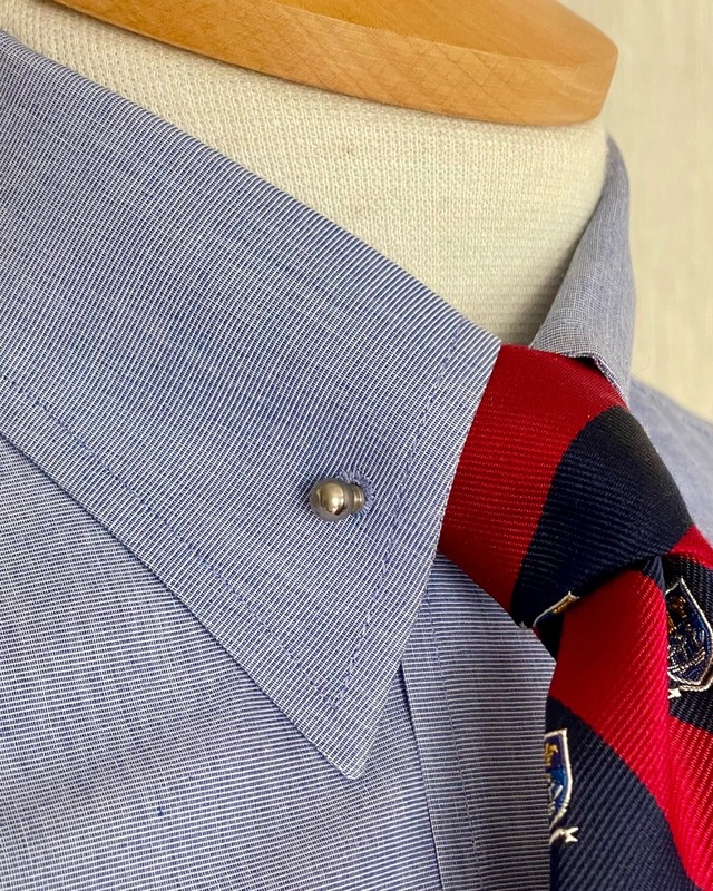 レオナルドディカプリオ主演のグレートギャツビーのコスチュームを担当したブルックスブラザーズによるコレクションの中からピンホールカラーシャツの紹介です。6ボタンのフロントにバレルカフ、背中はプリーツではなくギャザーを寄せて立体的に仕上げています。ノットが小ぶりになるネクタイを締めてカラーバーで襟を留め、タイを持ち上げるとクラシックな装いに相応しいVゾーンに仕上がります。ピンホールカラーシャツは既成では珍しいもの、写真の中のネクタイは付属しませんがシルバーのカラーバーは付いています。