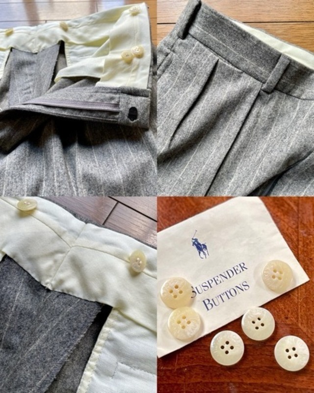 1991年秋冬もののグレーフランネル、チョークストライプスーツの紹介になります。組下のライニングは総取り替え、ジャケットの背裏も交換の上クリーニングを経てレストアを完了させました。レオロッチが監修したというラルフローレン独特のカマ襟が特徴のスーツは米国製、ユニオンチケットも印字が残っており30年以上経過したビンテージスーツとは思えない良好なコンディションを保っています。